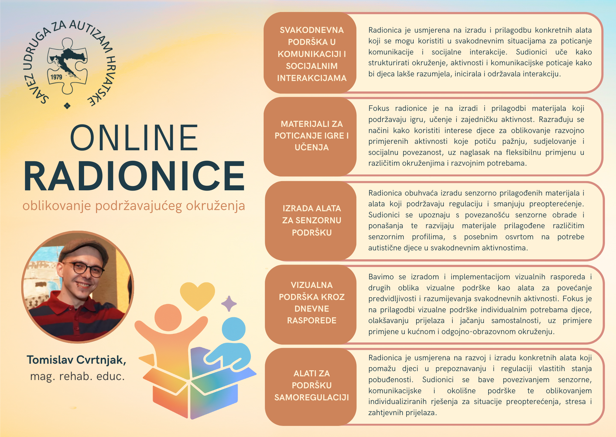 Seriju edukacija i radionica o ranom razvoju vodit će Tomislav Cvrtnjak, edukacijski rehabilitator i voditelj programa u Savezu udruga za autizam Hrvatske. U svom radu usmjeren je na neposrednu podršku autističnim osobama, njihovim obiteljima i stručnjacima, kroz edukacije, savjetovanje i razvoj ciljanih programa društvene participacije i osnaživanja autističnih osoba i njihovih obitelji. Stručni interesi fokusirani su na unapređenje razumijevanja autizma kroz pristup temeljen na ljudskim pravima.